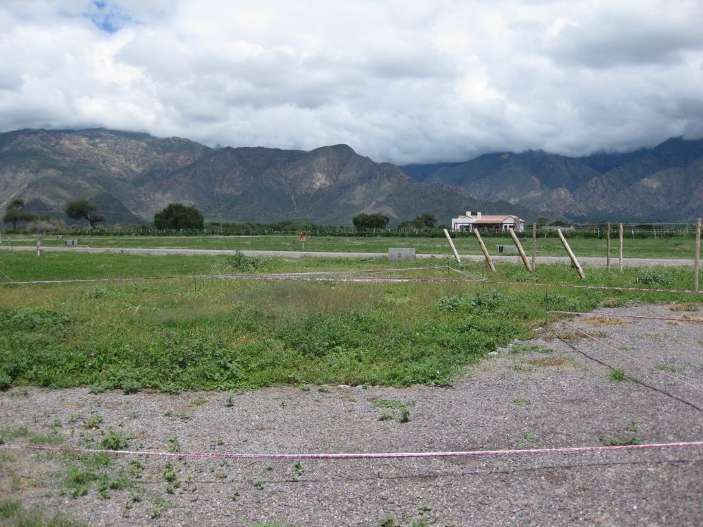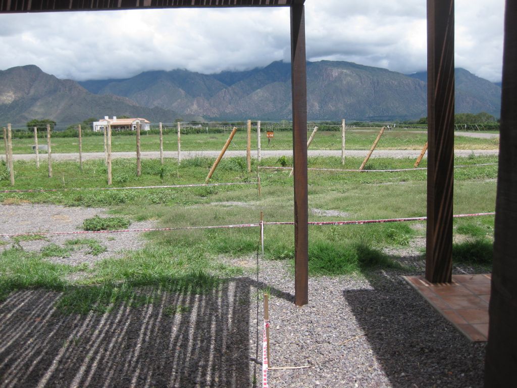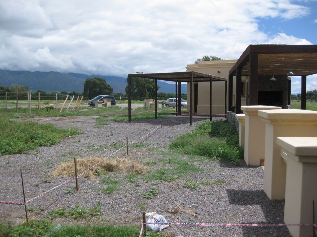 At approximately 5 meters from the entry, you will arrive to a parking lot (10 x 10 m) belonging to the guesthouse. It has the benefit of enlarging the parking area and avoiding too many cars from being next to the main house. In fact, a crowded parking place would ruin the view from the “parrilla”. The road, with a boundary of grasses and flowering plants, continues towards the main parking lot, which will have the shadow of three molle trees and a trellis for two cars.